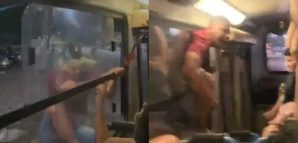247 - Um vídeo viralizou nesta semana nas redes sociais e mostra os passageiros desesperados tentando avisar o motorista para acelerar antes do rapaz se segurar na janela do veículo.
