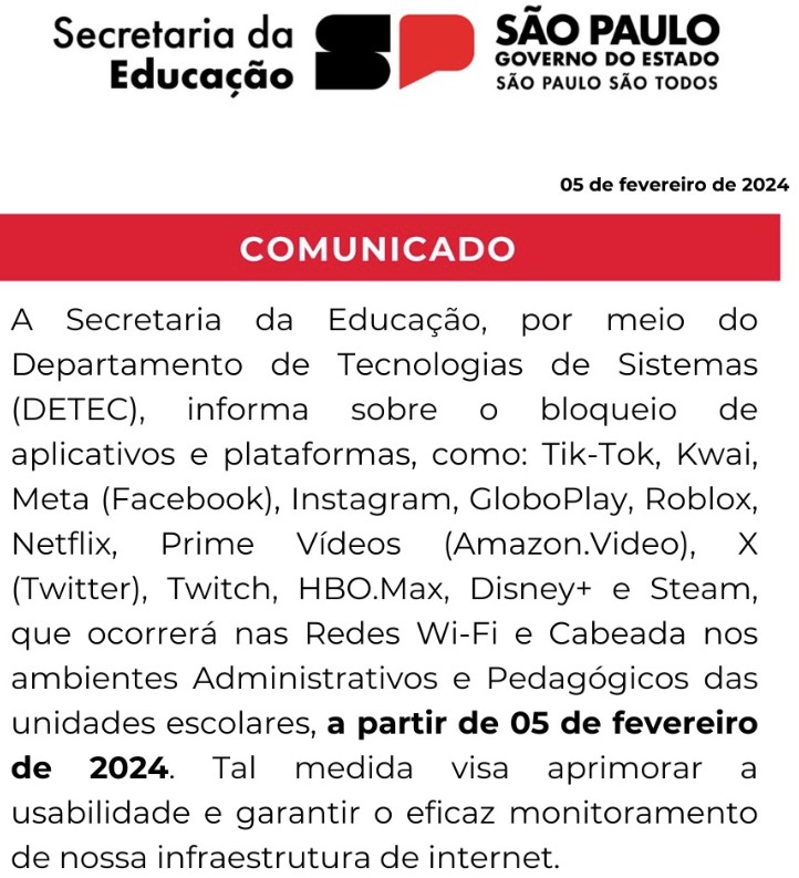 aplicativos e plataformas será suspenso em nossas Redes Wi-Fi e Cabeada nos ambientes