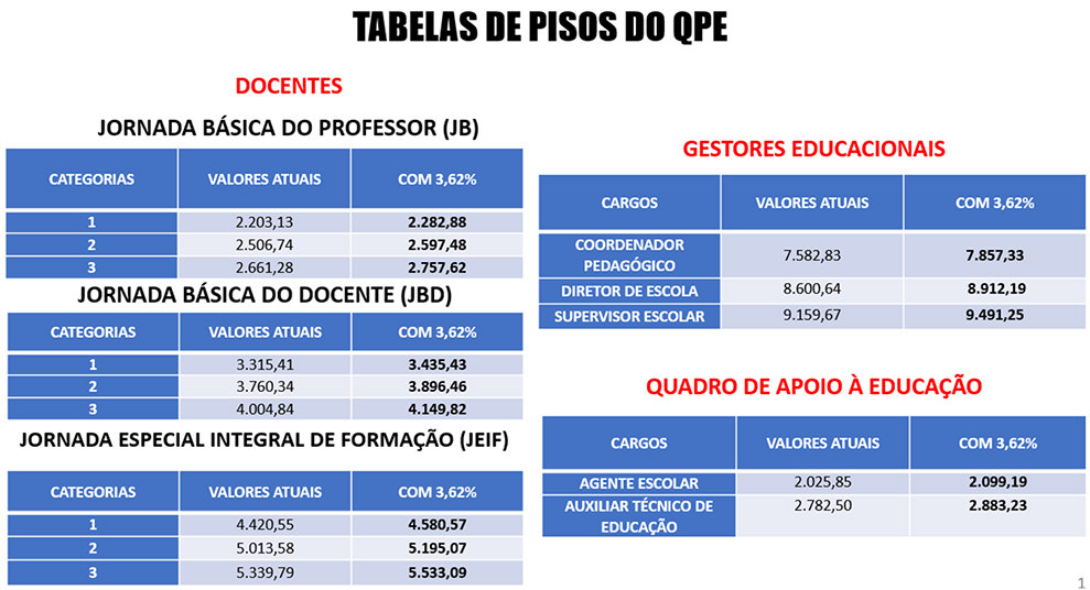 Veja como ficarão os pisos do QPE com o reajuste de 3,62%: