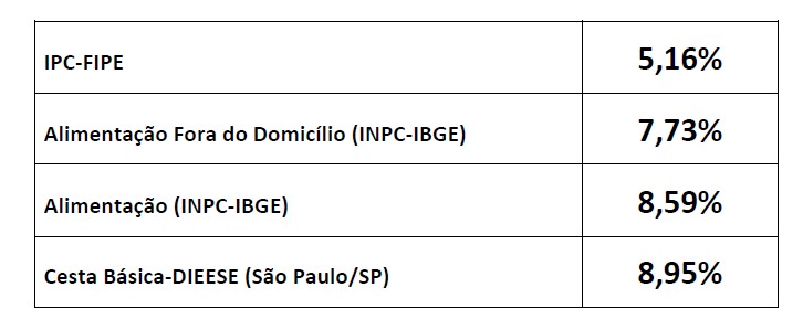 Pior do que almoçar na rua, porém, está sendo garantir a alimentação dentro de casa, porque os restaurantes não repassam integralmente o aumento de seus custos, por temor de perder fregueses. Tanto o item Alimentação, do IBGE, que inclui os gastos dentro e fora do domicílio, como a Cesta Básica da cidade de São Paulo, pesquisada pelo DIEESE, mostram um encarecimento ainda maior, de quase 9%. Mas o reajuste do VA será de 2,60% por longos 12 meses, chegando aos 5,2% quando mais um ano de inflação tiver transcorrido.