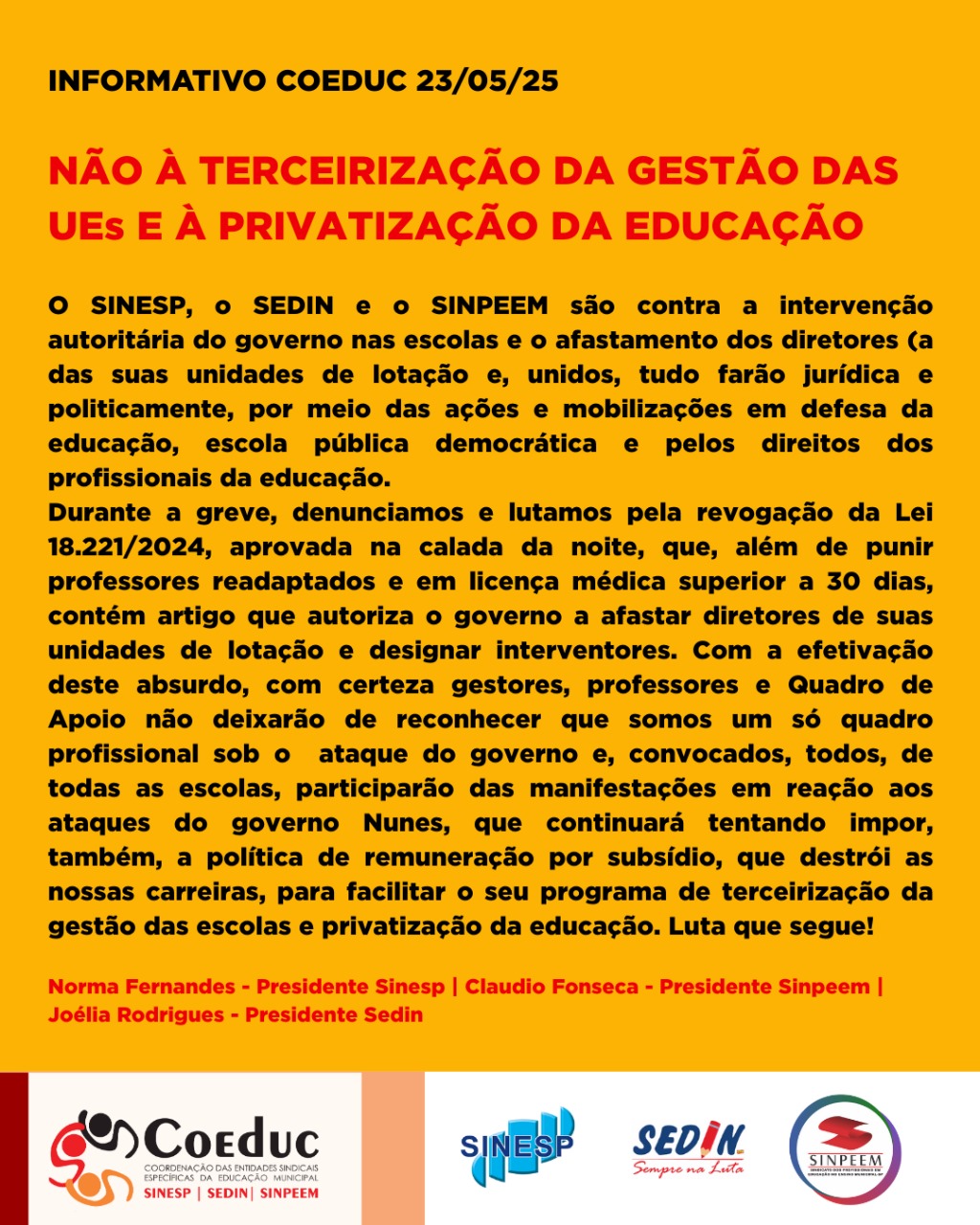 23/05/2025 - Não à terceirização da gestão das UEs e à privatização da educação