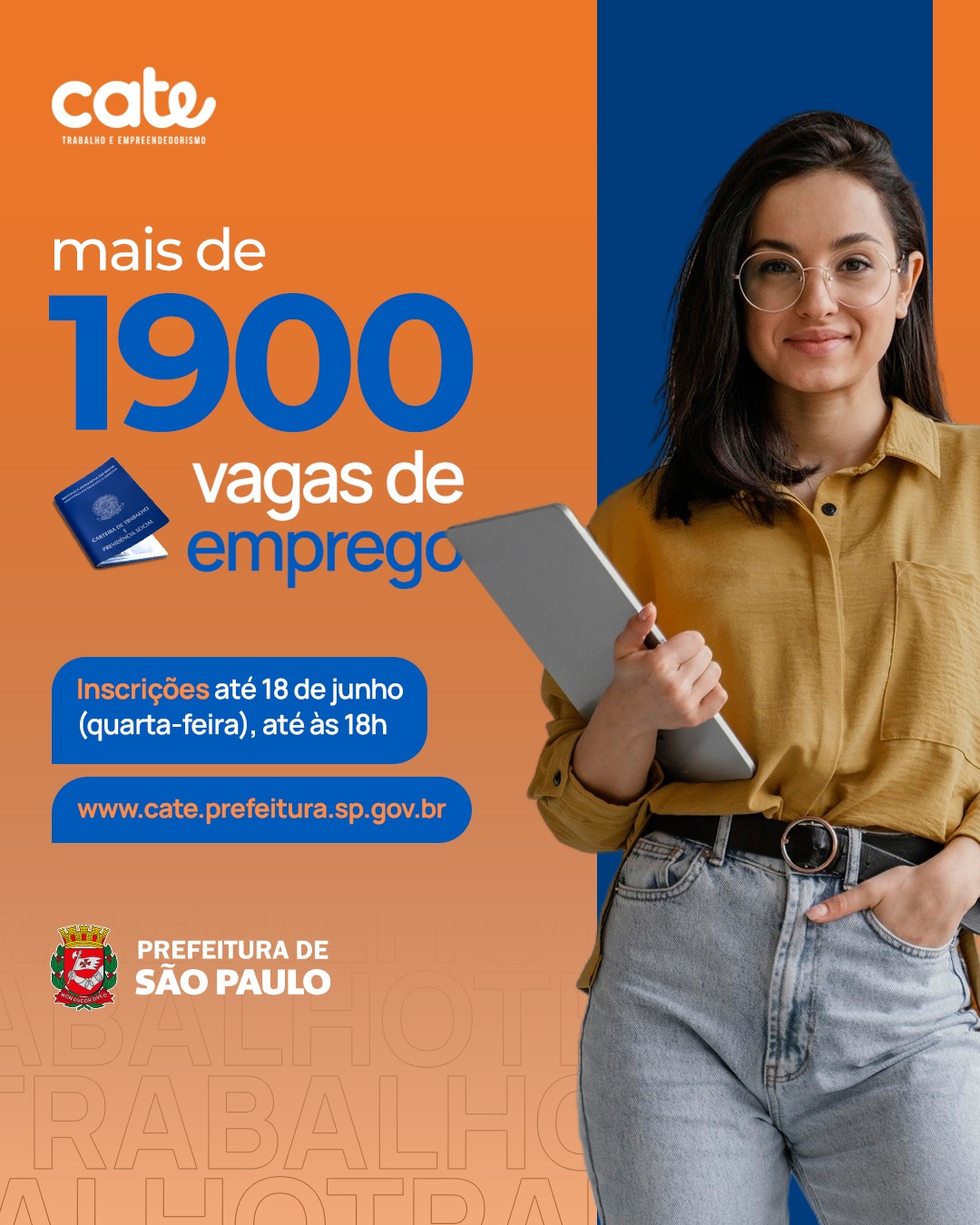 Para os moradores da cidade de São Paulo estão sendo oferecidas mais de 1.900 vagas de emprego pelo Cate - Centro de Apoio ao Trabalho e Empreendedorismo, da Prefeitura de São Paulo. Os salários das oportunidades variam entre R$ 731 (auxiliar administrativo - horário reduzido) e R$ 3.800 (pintor de edifícios). As áreas de atuação são: comércio, serviços, construção civil, saúde, entre outros. Para se candidatar, basta realizar o cadastro no Portal Cate ou comparecer a uma das 46 unidades da rede, que incluem postos fixos e móveis, até 18 de junho. No atendimento presencial, é necessário apresentar RG, CPF e carteira de trabalho, que pode ser tanto física quanto digital.
