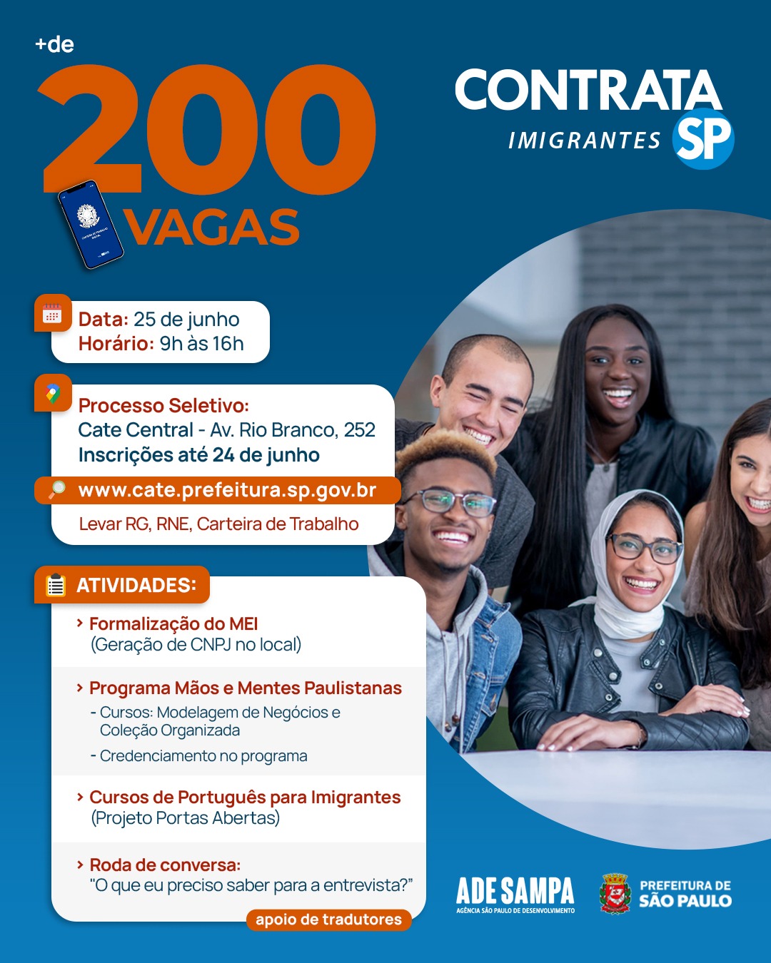A Prefeitura de São Paulo, em celebração ao Dia do Imigrante, comemorado em 25 de junho, realiza nesta quarta-feira o Contrata SP – Imigrantes para auxiliar na inserção no mercado de trabalho deste público. A ação de empregabilidade ocorrerá no Cate Central, avenida Rio Branco, 252, das 9h às 16h. Os interessados podem antecipar a inscrição no Portal Cate ou comparecer diretamente na unidade com documentos como RG, RNM - Registro Nacional Migratório ou RNE - Registro Nacional do Estrangeiro, protocolo de refúgio e carteira de trabalho, que pode ser o modelo digital.