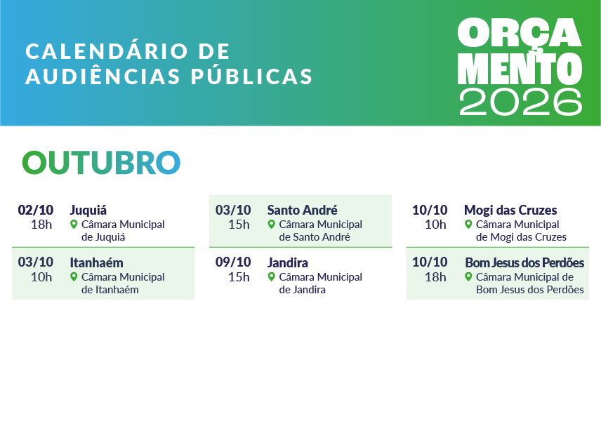 A Assembleia Legislativa do Estado de São Paulo definiu o calendário com as datas e os locais das audiências públicas que vão debater o Orçamento estadual para o ano de 2026. O ciclo de reuniões, realizado pela Comissão de Finanças, Orçamento e Planejamento (CFOP) da Casa, terá início no dia 7 de agosto, no município de Rosana, e será encerrado em Bom Jesus dos Perdões, no dia 10 de outubro.